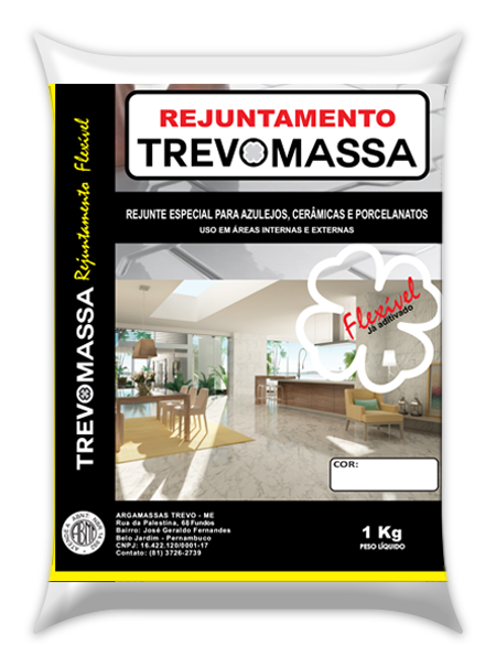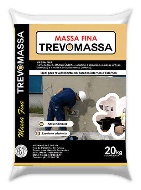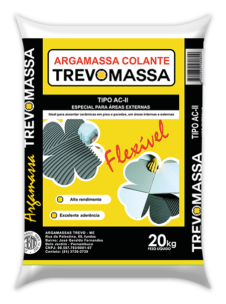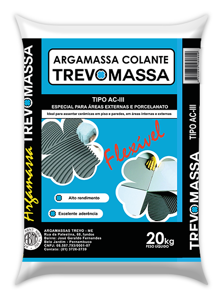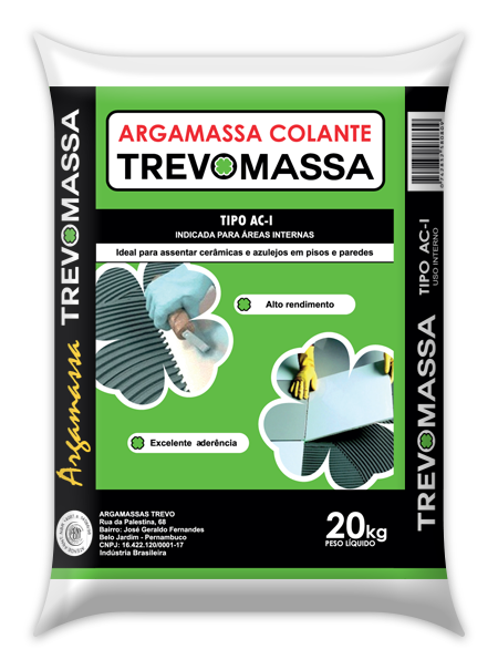 Na reforma ou construção a solução confiável para assentamento cerâmico da sua obra está na linha de argamassa TREVOMASSA. A TREVOMASSA é ideal para qualquer ambiente da sua obra e garante secagem rápida, aderência, durabilidade, alto rendimento e perfeito acabamento nas versões Tipo AC-I, AC-II e AC-III. Tudo isso atendendo aos padrões de exigências das normas ABNT. A linha de argamassa TREVOMESSA é a qualidade que sua obra precisa e é só pedir num armazém perto de você. Argamassa TREVOMASSA sua obra precisa dessa confiança.